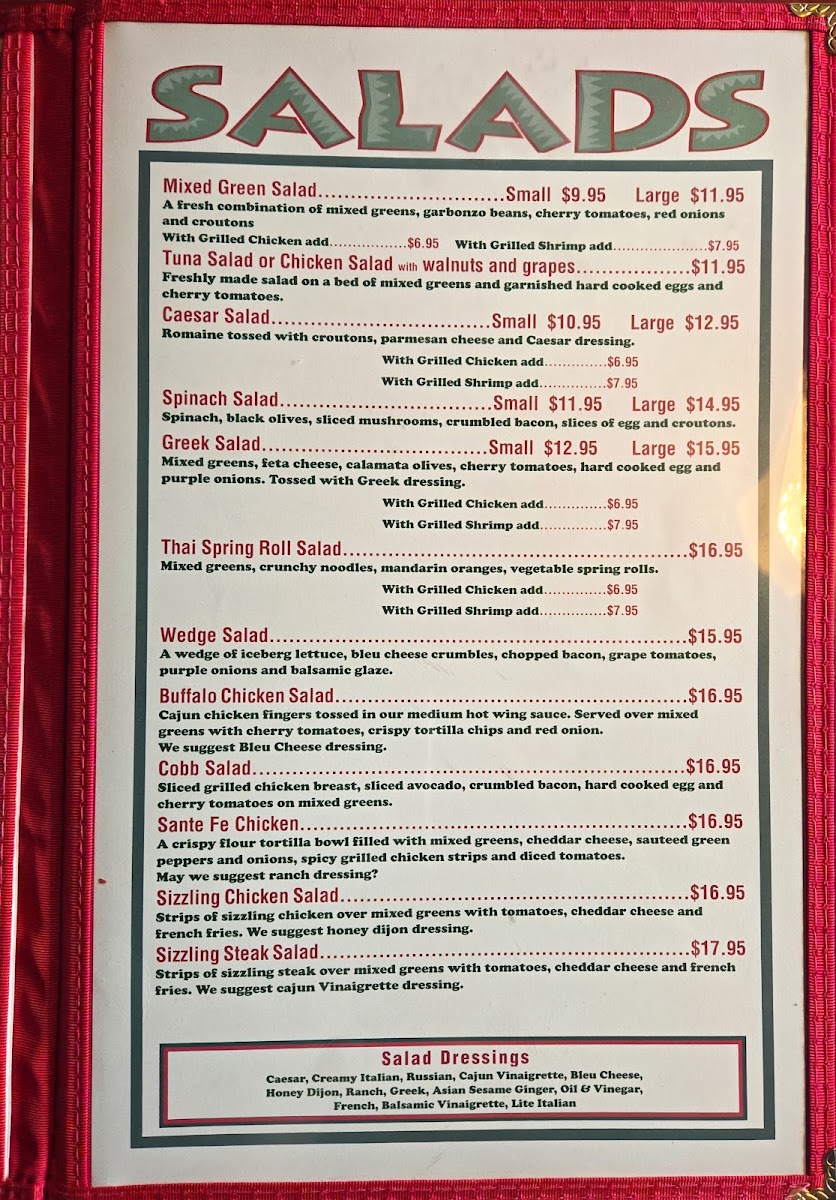 strips of sizzling steak over mixed greens with tomatoes, cheddar cheese and french fries; we suggest cajun vinaigrette dressing