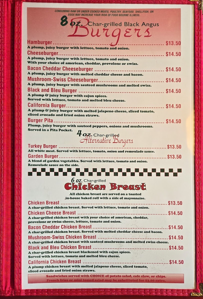 a char - grilled chicken breast with your choice of american, cheddar, provolone or swiss cheese, lettuce, tomato and onion